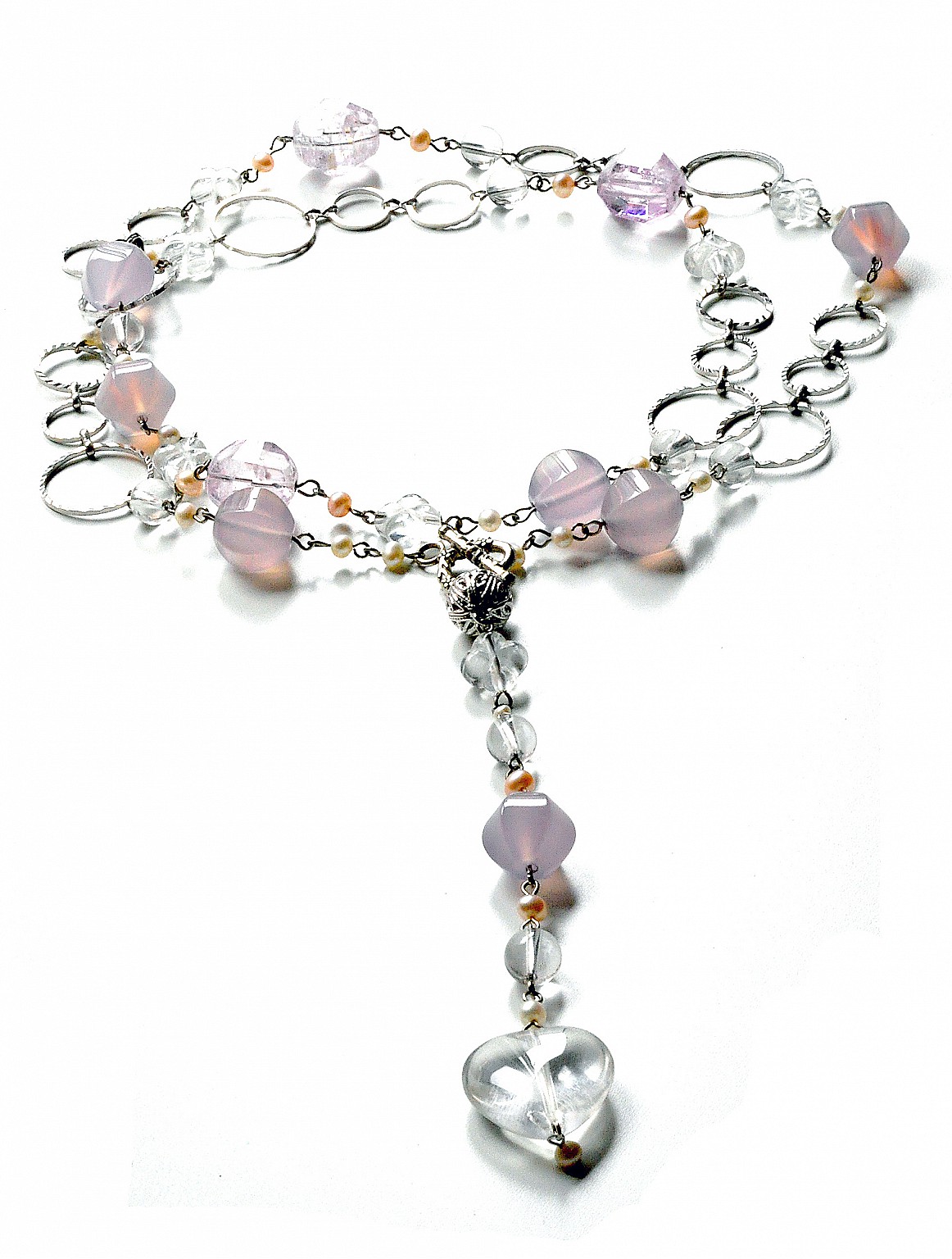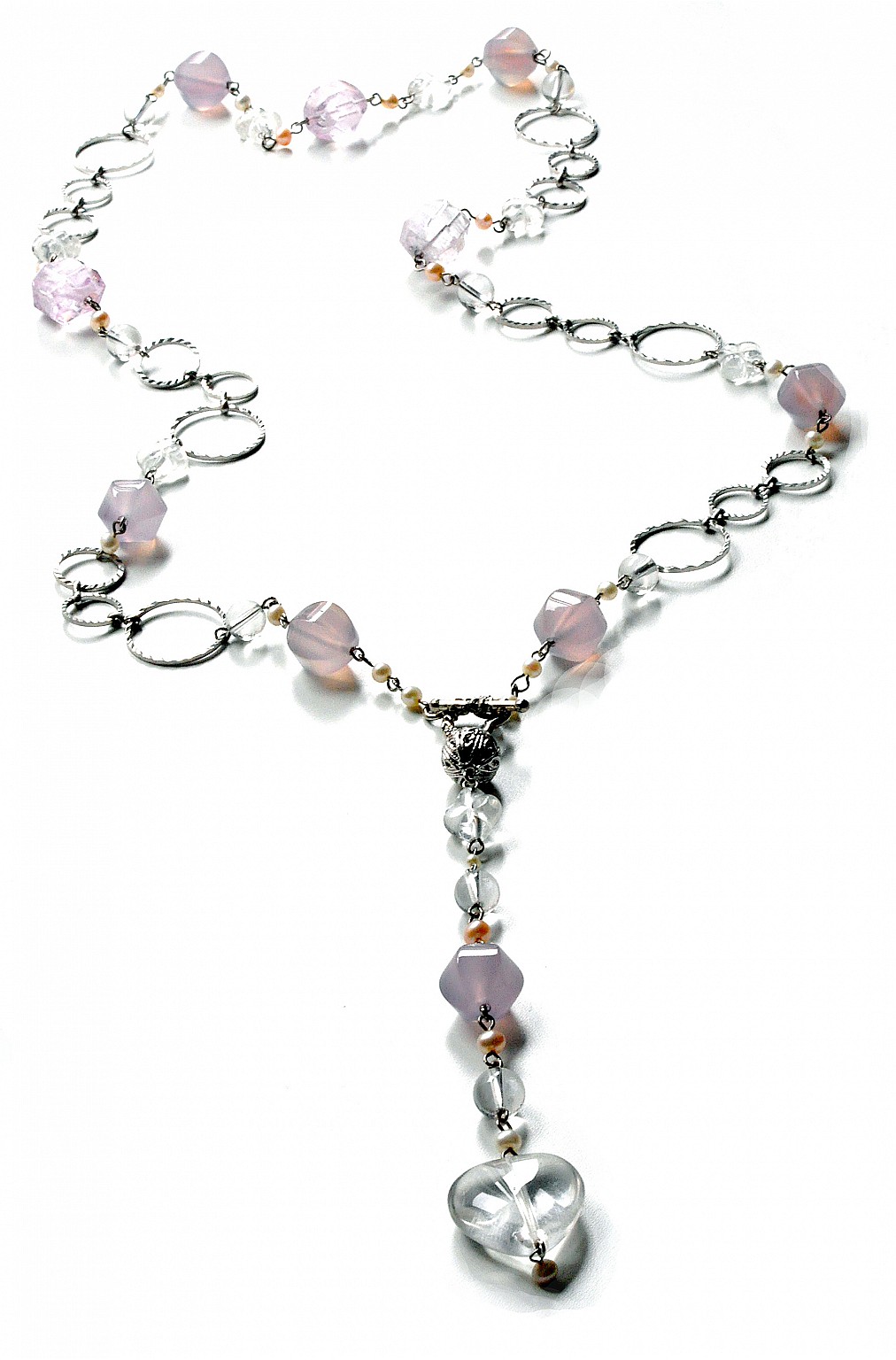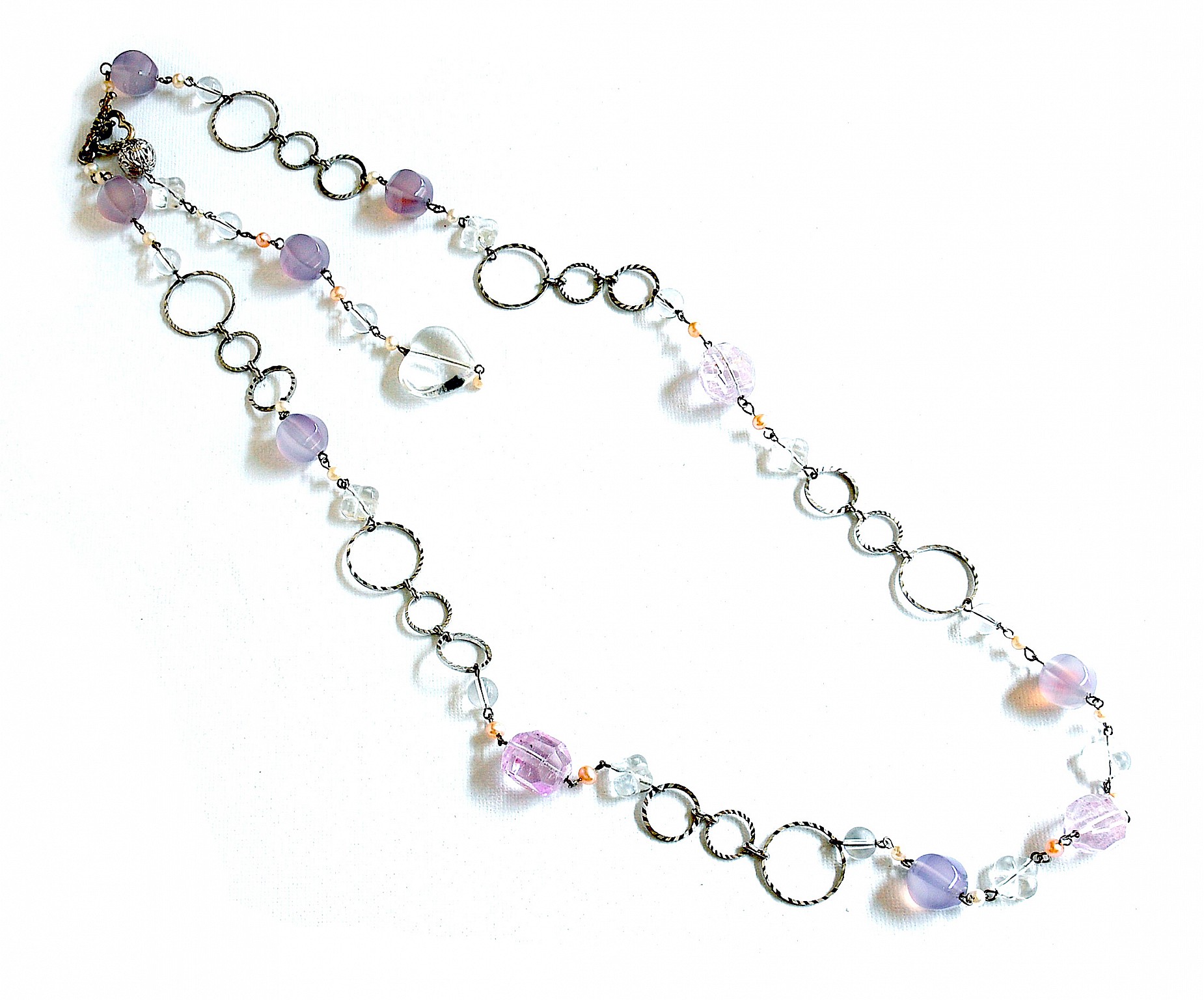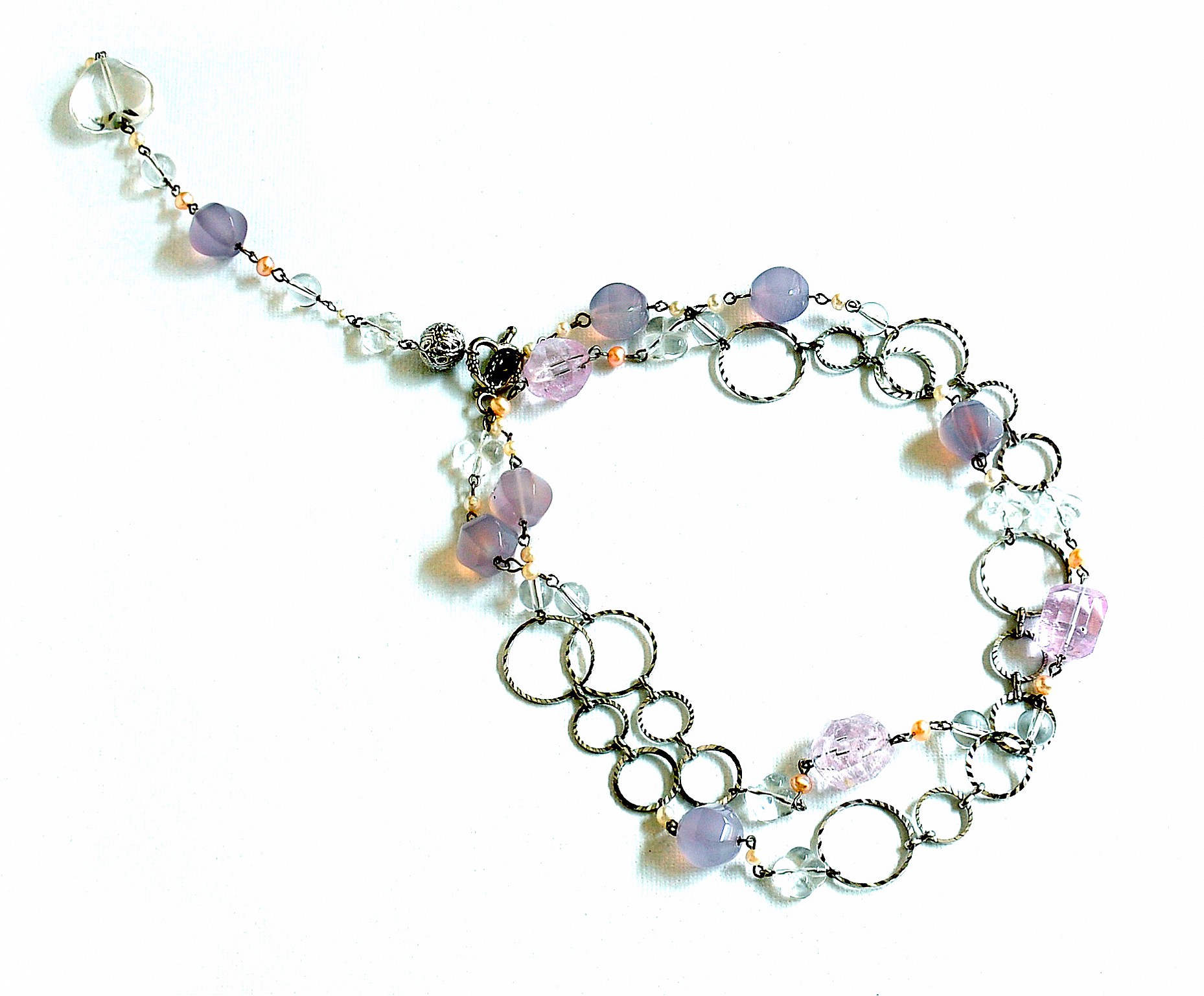 Kunzite, Purple Agate Chalcedony, Clear Quartz, Pearl Necklace