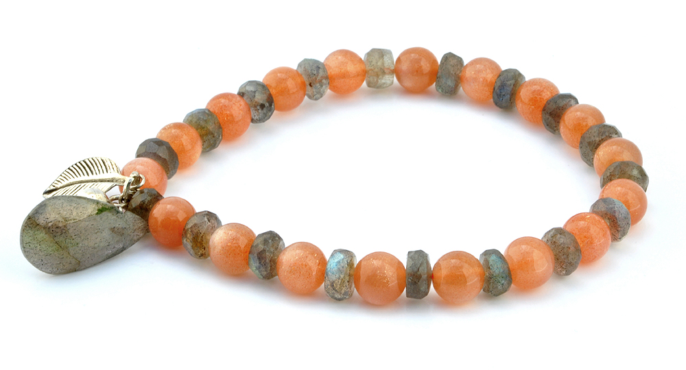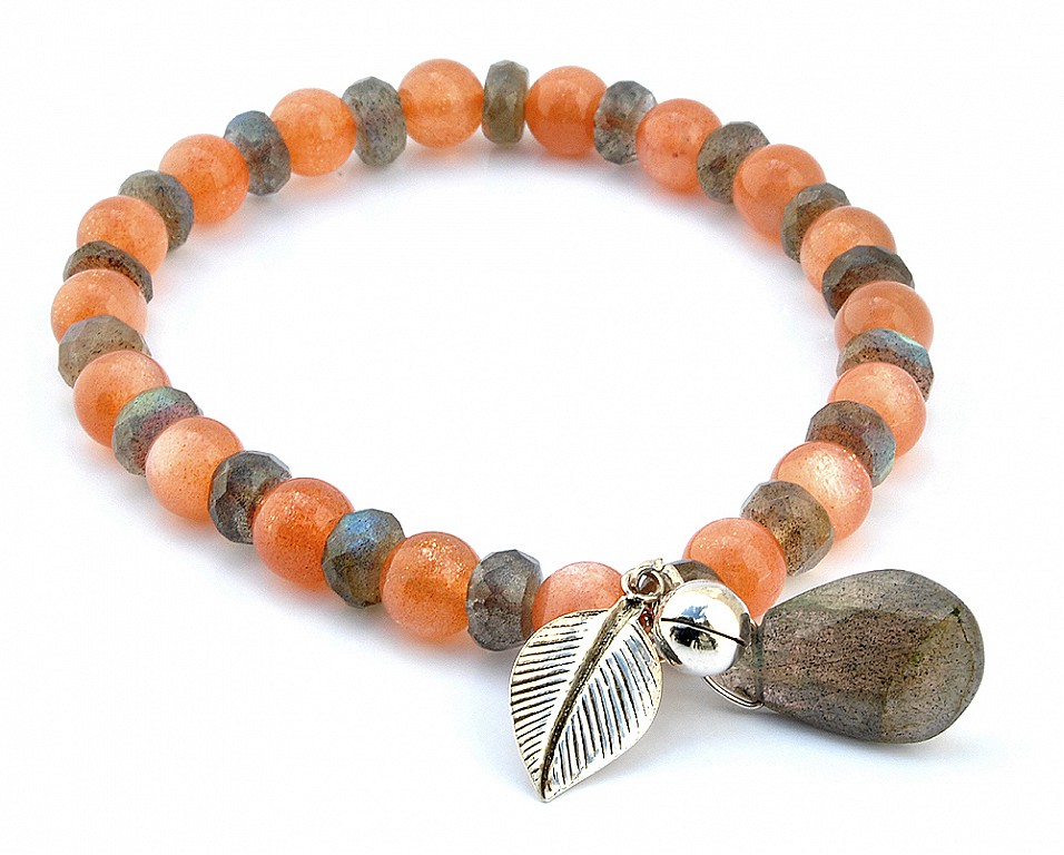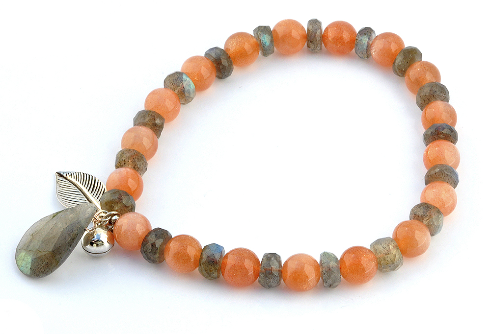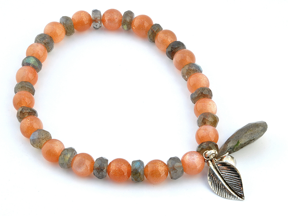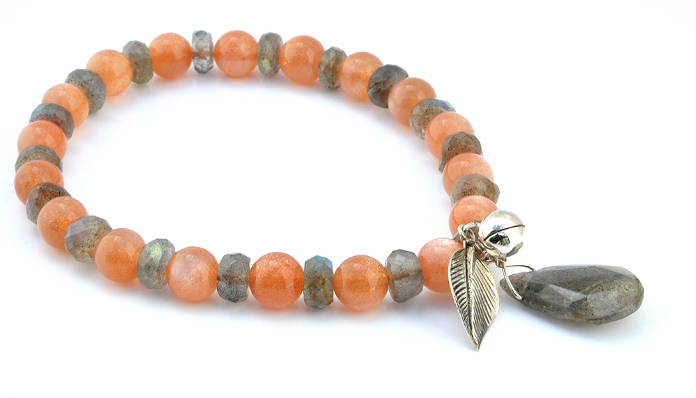 Cat's eye sunstone 8mm labradorite wheel cut surface 8mm + sterling silver leaf, silver bell, labradorite drop cut surface pendant bracelet
