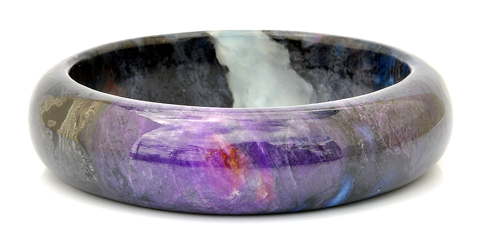 表面有紋理,呈現玻璃到臘狀的光澤,皇家帝王紫屬於王者的顏色,最為高貴。櫻花紫舒俱徠石最受年輕女子喜愛,冰種紫羅蘭舒俱徠石雖不及帝王紫的級別,但顏值也是很高的,舒俱徠石一旦達到冰種,質地非常澤亮。舒俱徠石只有在最近數十年才出現在這個星球上;直到現在,人類仍尚未準備好去接受舒俱徠石所反射出的深紫色光束。不像紫水晶所展現的晶瑩剔透紫色,舒俱徠石通常是濃郁的、不透明及不透光的,它的紫色是最深暗且具有目的性的。