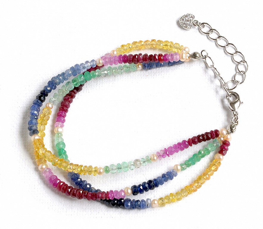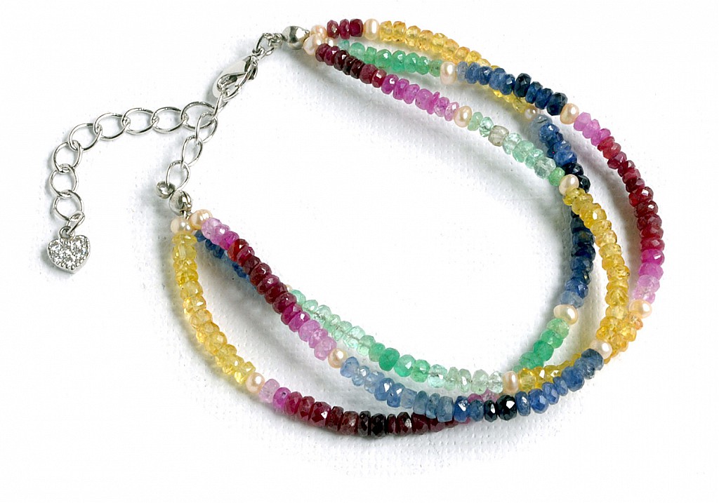 時尚3 股彩色剛玉,紅寶石、藍寶石、綠寶石、黃寶石搭配珍珠串成一條手鍊,碎鑽心型吊墜結尾。