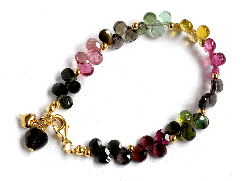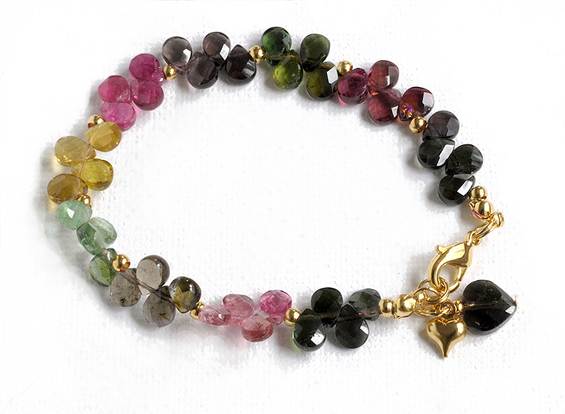 這是一款華麗的糖果碧璽水滴切割手鍊,色澤濃郁鮮豔,淨度、亮度都相當高,如此漂亮的品質實屬稀少難得!每顆寶石大小約為5x8mm。它們顏色多彩燦爛,分別為紅寶石色,桃紅色,薄荷綠,藍綠色,黃色,粉紅色,綠色,紫灰色。手鍊結尾以深鐵灰色心形切割碧璽垂吊。金屬配件可付少許費用換成義大利K金,戴得更久,更有價值!