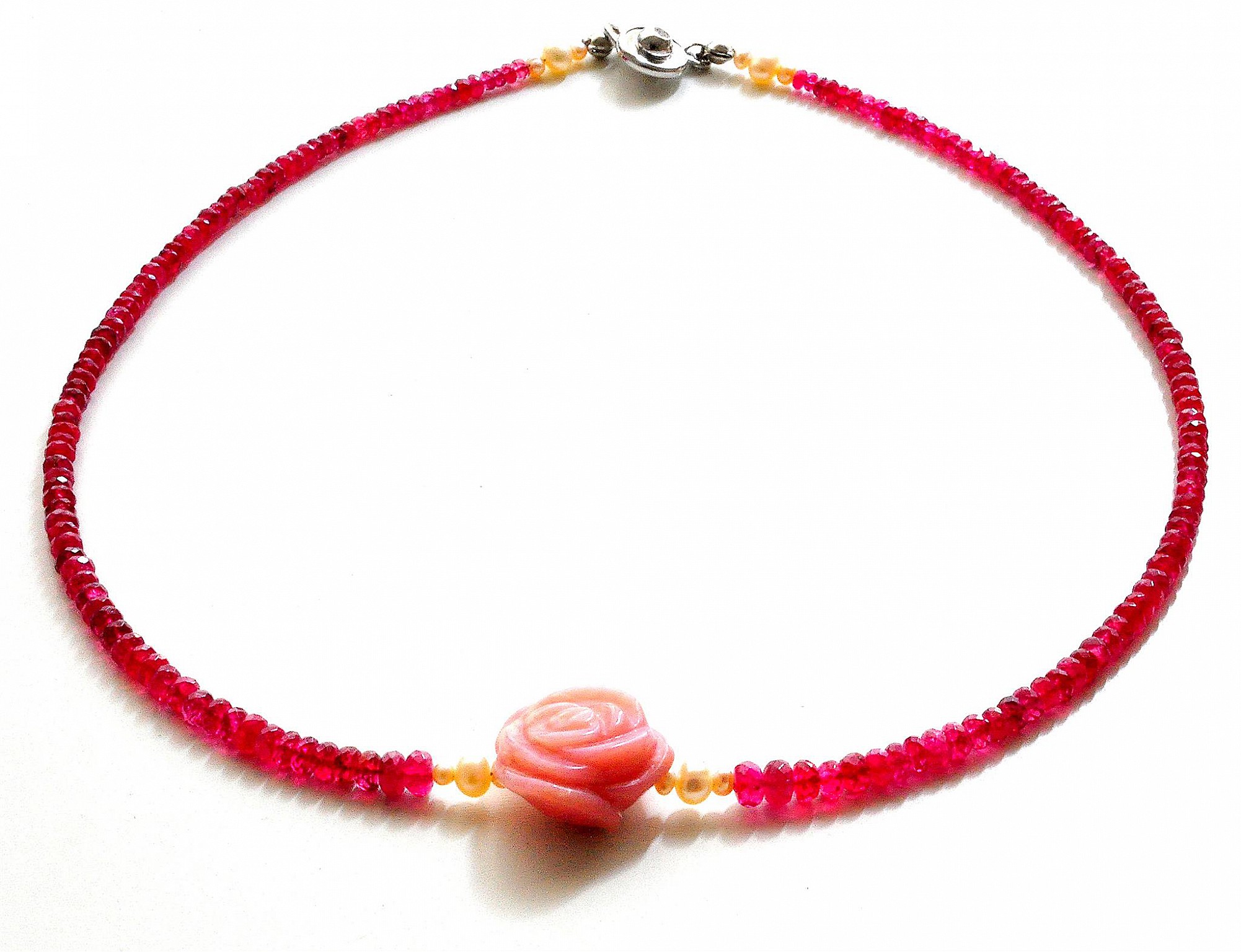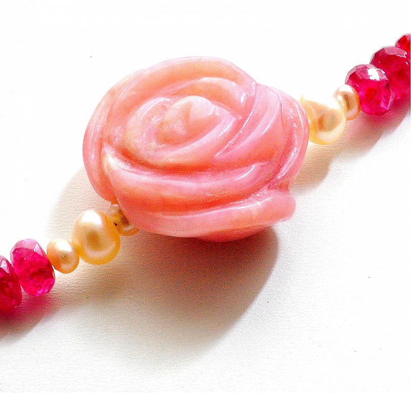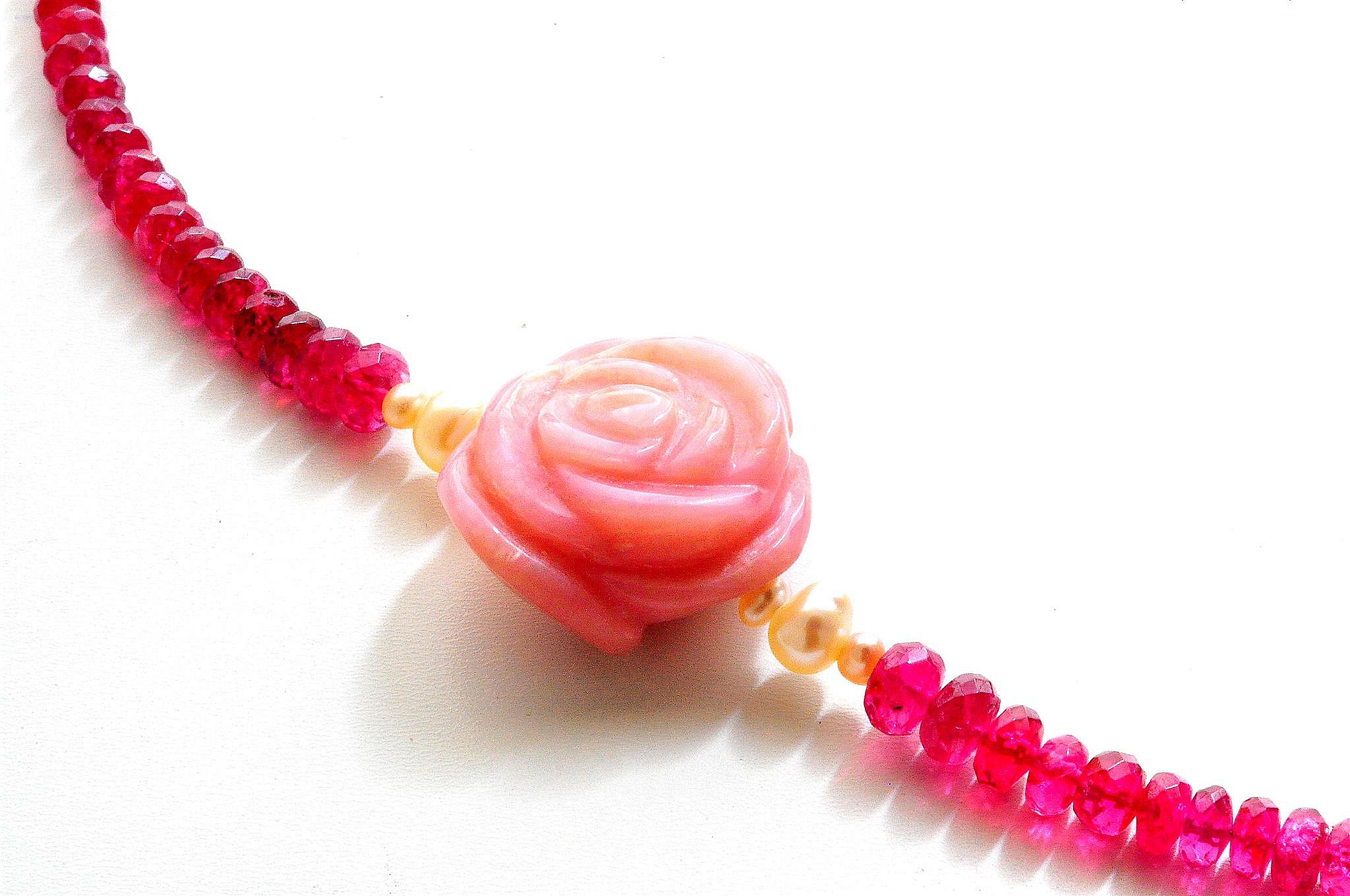 此款項鍊由頂級紅寶石2-4mm切割+精雕粉紅蛋白石玫瑰墜,綴飾小珍珠成長度40公分的項鍊,配戴至鎖骨處,性感、典雅,散發個人獨特的氣質。
