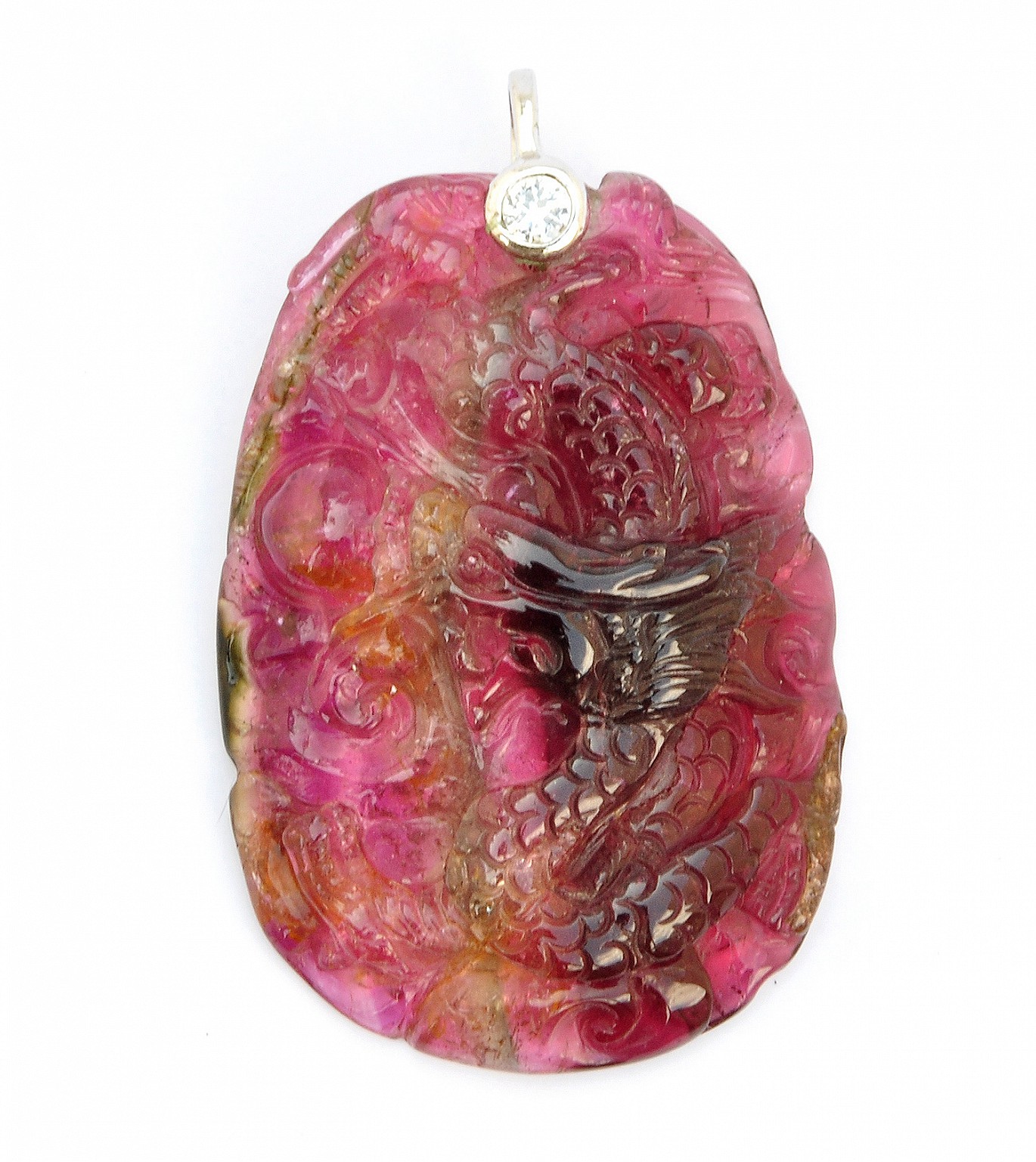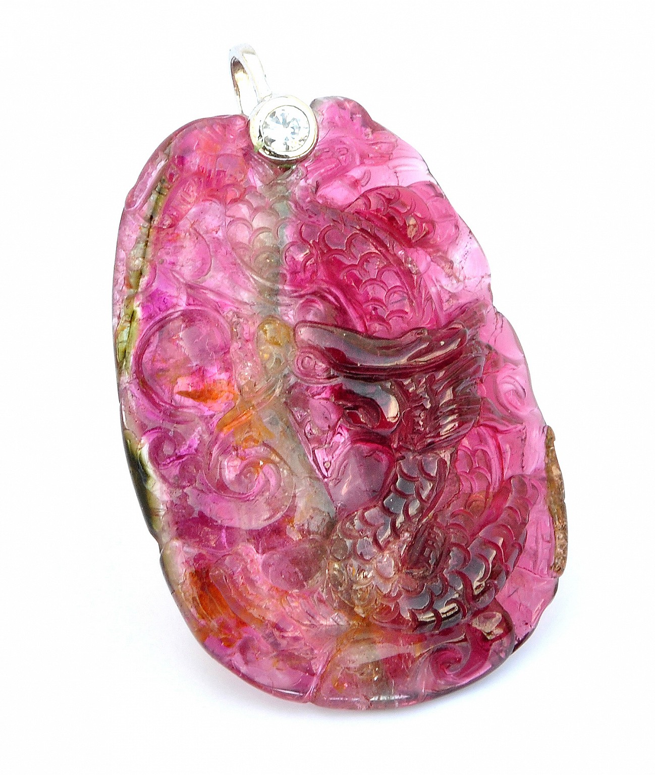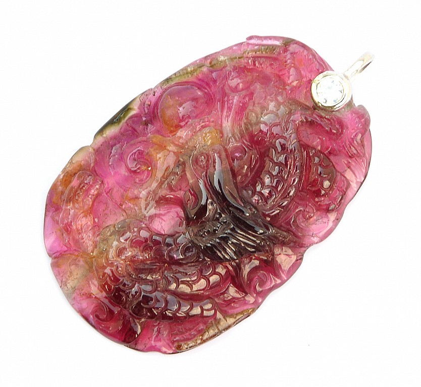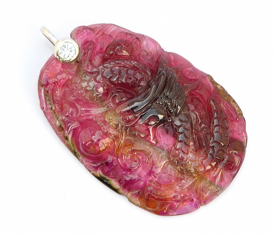 目前大塊的西瓜碧璽相當稀少,尤其是色彩豔麗、油潤冰透的西瓜碧璽。此件精緻工藝雕刻龍之尊,穿梭在桃紅色雲霧中的龍,龍鬚在風中飄動,神龍吐珠,龍睛炯炯有神、活靈活現,細膩的雕刻,寶石本身是色彩鮮豔、豐富多彩的天然彩虹碧璽,市場尤為少見,深具增值潛力。龍行天下特別尊貴大器!由經驗豐富的師傅切割、打磨、拋光、雕刻,每一步驟都非常用心,展現其水潤光澤、吉祥如意,絕對是值得收藏的極品~